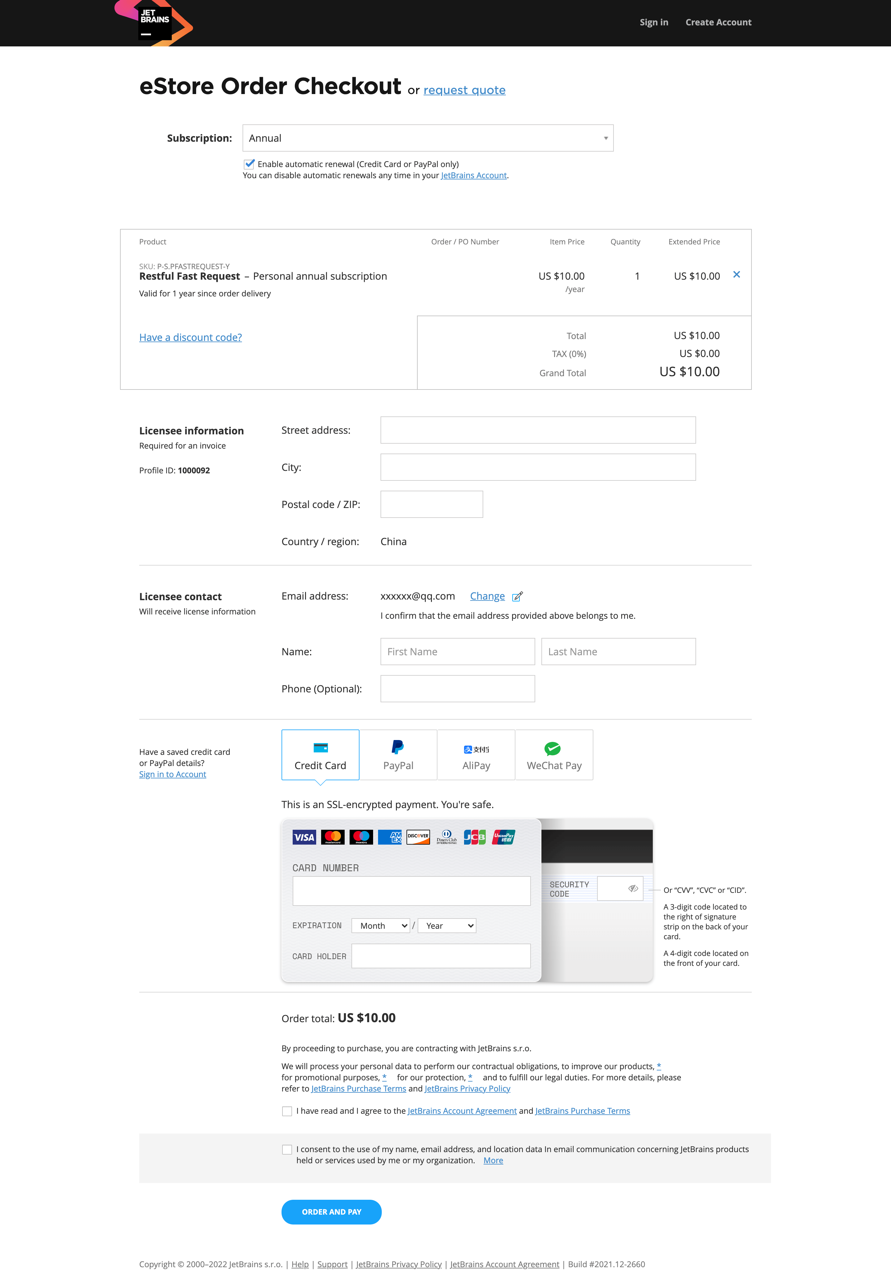 如果您没有注册 jetbrains 账号并登录,则会进入此页面,这边需要输入接受 license 的邮箱地址 点击 next 进入购买确认页面